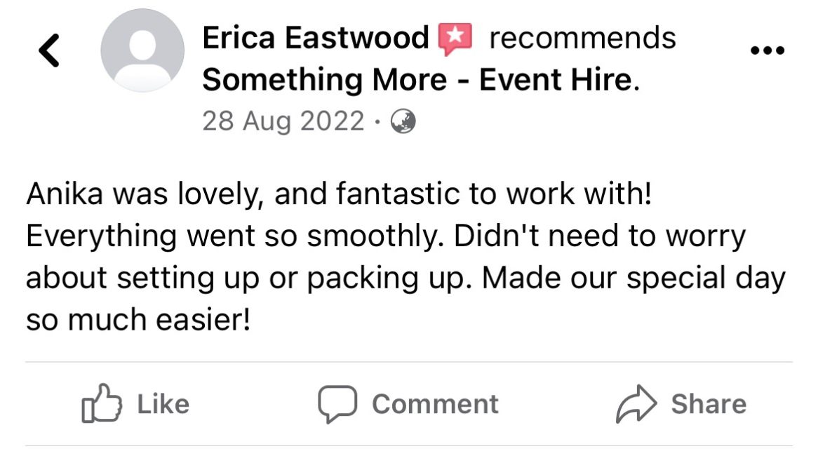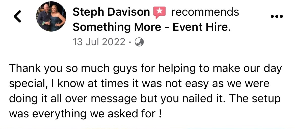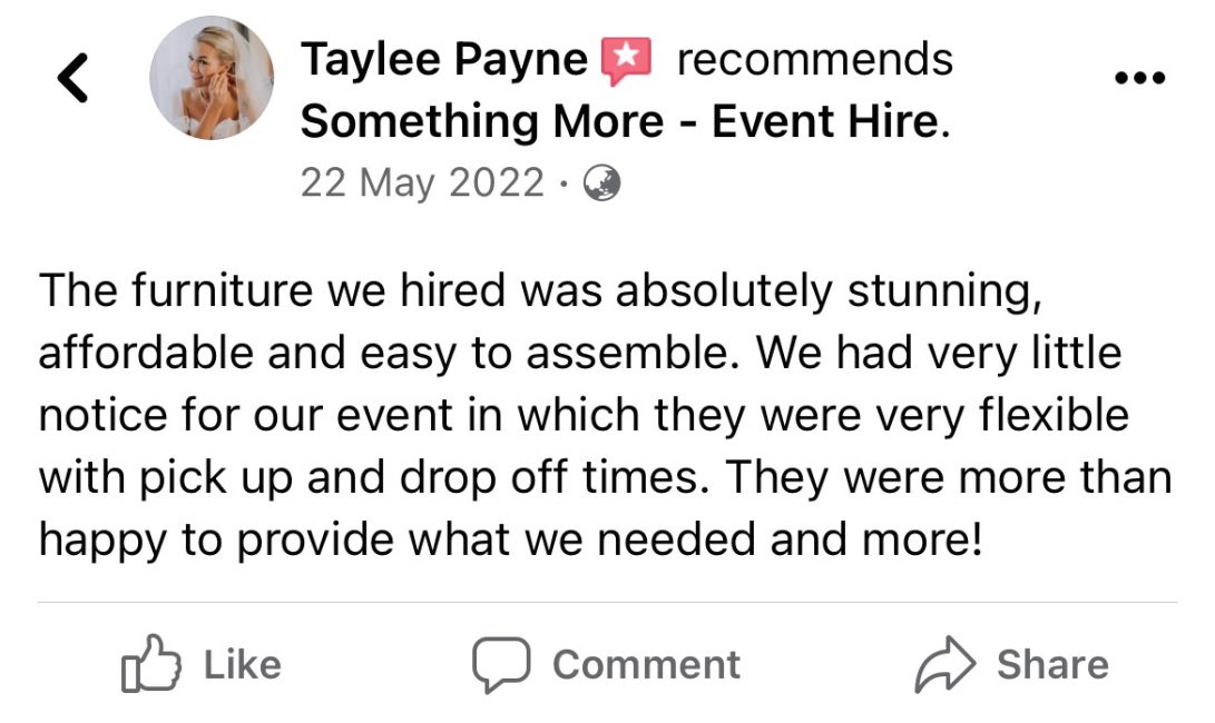 At Something More Event Hire our goal is to bring to life the vision of our clients with our growing inventory of hire items. We offer delivery, set up and pack down of a range of items including tables, chairs, décor and personalised signage. No matter the occasion we can help tailor the environment to your needs.